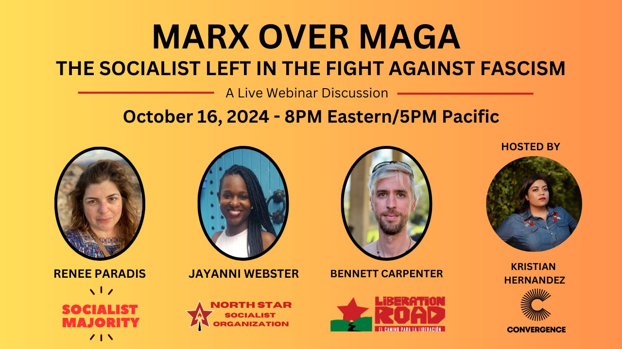 Now, we’re excited to offer a live webinar version of that discussion, hosted by Convergence Magazine. I hope you can join us this coming Wednesday, October 16th at 8:00 PM Eastern (5:00 PM Pacific) for “Marx Over MAGA: The Socialist Left in the Fight Against Fascism.” Click here to register now.