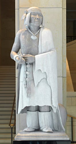 Some 80 years later, the Pueblo people organized a general uprising. Their leader was named Po’pay, and the revolt is often named after him. Through extraordinary coordination, the Pueblo people managed to drive the Spanish out. Although this hard-won independence lasted only 12 years, the episode proved instrumental in challenging the slave labor system, forcing the Spanish to alter their policies towards the Pueblo, and allowing the Pueblo people to preserve their language, culture and heritage to this day. Today, New Mexicans honor this history with a statue Po’pay in the US Congress.