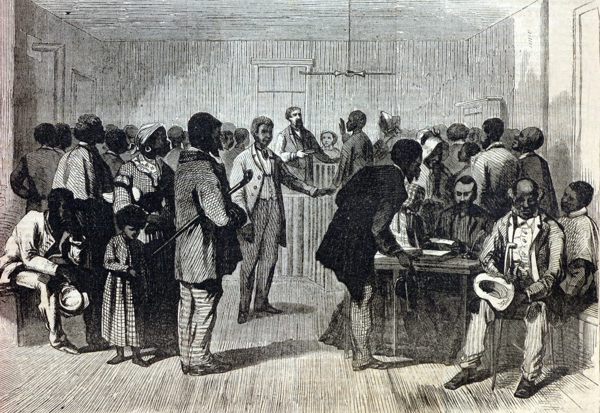 Victory in the civil war, and in the political struggle after, meant significant gains: voting rights, land ownership, and labor protections extended to millions of formerly enslaved Black workers. The agrarian means of exploitation changed hands and transformed into the first broad basis of U.S. Black economic enfranchisement. Labor rights transformed work. Voting rights transformed state, local, and federal governments. These wins were secured offensively on site, and defended politically in state legislatures.
