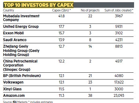 Among the top ten global corporate investors by capital expenditures (CAPEX) were four Chinese companies, three from the US, two from the Arabian Gulf and one from Europe. Of the top five, Exxon was the only US corporation (at number three, with $15.7 billion invested) while number two was United Energy Group from China at $17.7 billion. Looming above all was Mubadala Investment Group from Abu Dhabi (UAE) with $41.8 billion in capital expenditures in 22 projects.