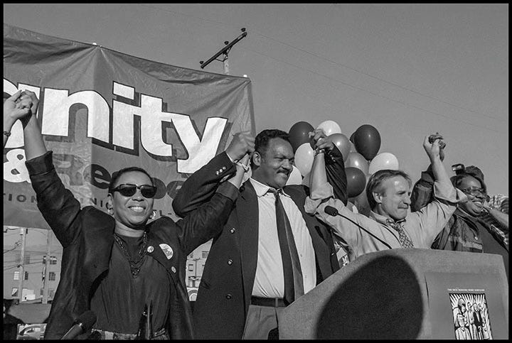 My fondest memories of Jesse Jackson are from his 1988 presidential run on Super Tuesday. As a member of the League of Revolutionary Struggle (LRS) and a contributor to its newspaper Unity, I spent six weeks with a fellow LRS member, a professional photographer, traveling through the southern region as part of the campaign’s advance team. The LRS was heavily invested and involved in both Jackson’s presidential campaigns and the Rainbow Coalition.
